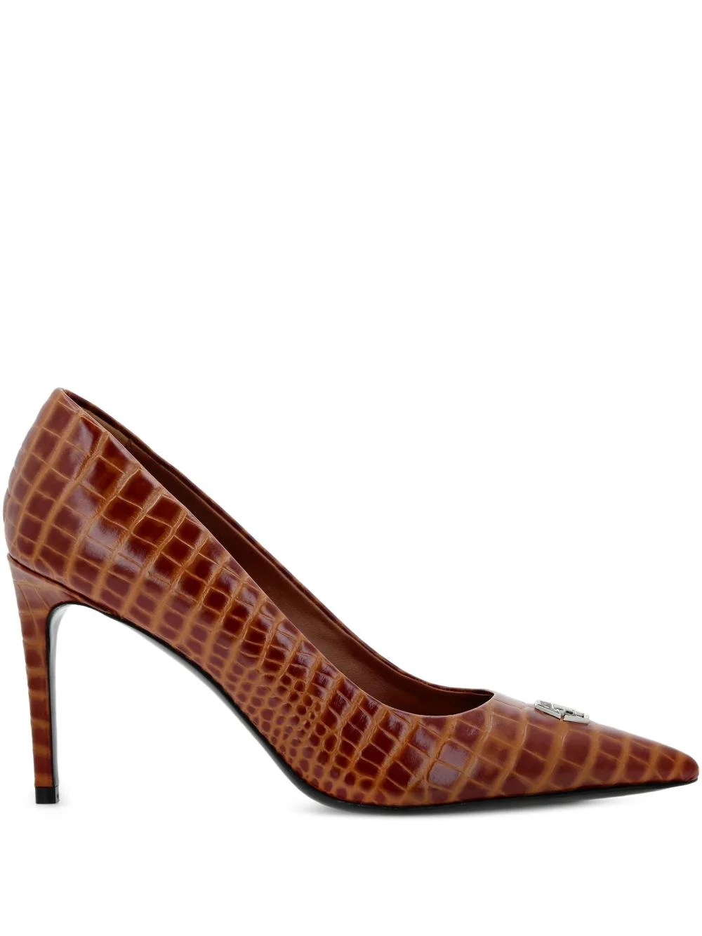 90mm crocodile-embossed pumps Highlights - Brown - Embossed crocodile effect - Pointed toe - High stiletto heel - Applique logo - Leather sole Made in Italy Composition Outer: Calf Leather 100% Lining: Lambskin 100% Sole: Calf Leather 100% SIZE & FIT Measurement HEEL 3.54 in(9 cm)