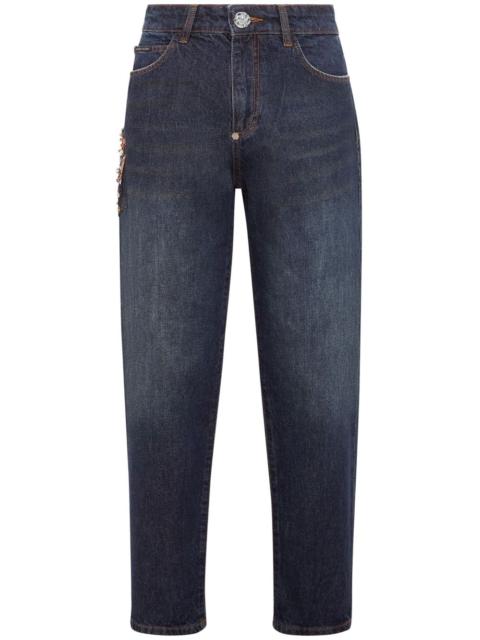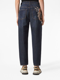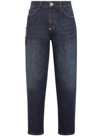 applique-detail tapered jeans Highlights - Navy blue - Cotton - Denim - Dark wash - Mid-rise - Applique detailing - Belt loops - Tapered leg - Concealed fly and button fastening - Classic five pockets Imported Composition Cotton 100%