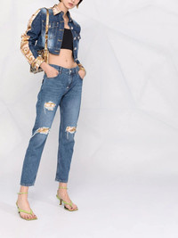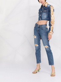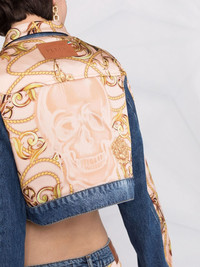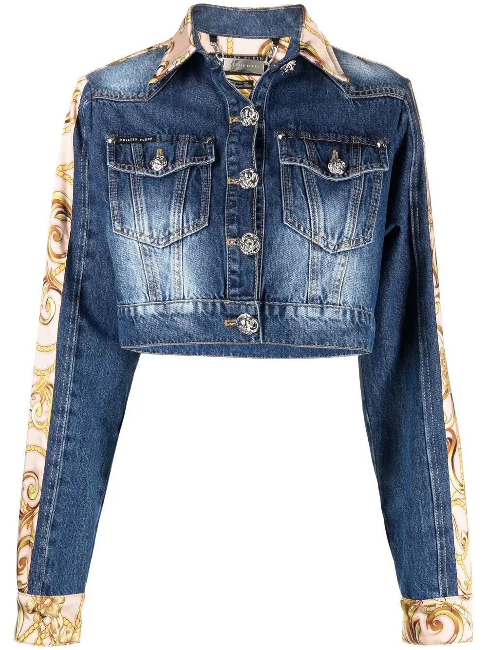 baroque-print cropped denim jacket blue cotton panelled design cropped baroque-pattern print two front flap pockets front button fastening logo patch to the rear classic collar straight hem long sleeves Imported Composition Cotton 100% Washing instructions Hand Wash