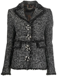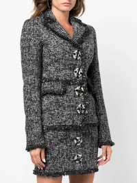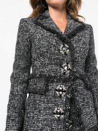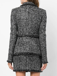 belted-waist tweed blazer black/white notched lapels brooch detail belted waist frayed detailing two side flap pockets Made in Italy Composition Outer: Polyester 83%, Acrylic 15%, Other fibres 2% Lining: Polyester 100% SIZE & FIT Model measurements Height 5 ft 9 in(1.75 m) Bust/Chest 32.67 in(83 cm) Hips 36.22 in(92 cm) Waist 24.8 in(63 cm) FittingInformation This piece fits true to size. We recommend you get your regular size Cut for a slim fit Made with a mid-weight non-stretch fabric Washing instructions Dry Clean Only