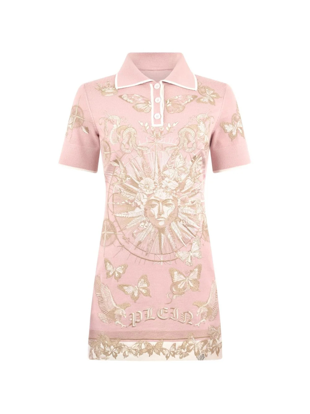 butterfly embroidery collared mini dress Highlights - Pink - All-over embroidery - Classic collar - Ribbed hems - Short button fastening - Label on yoke Made in Italy Composition Cotton 100%, Wool 50%, Modacrylic 50% Washing instructions Read Manufacturer Guidelines