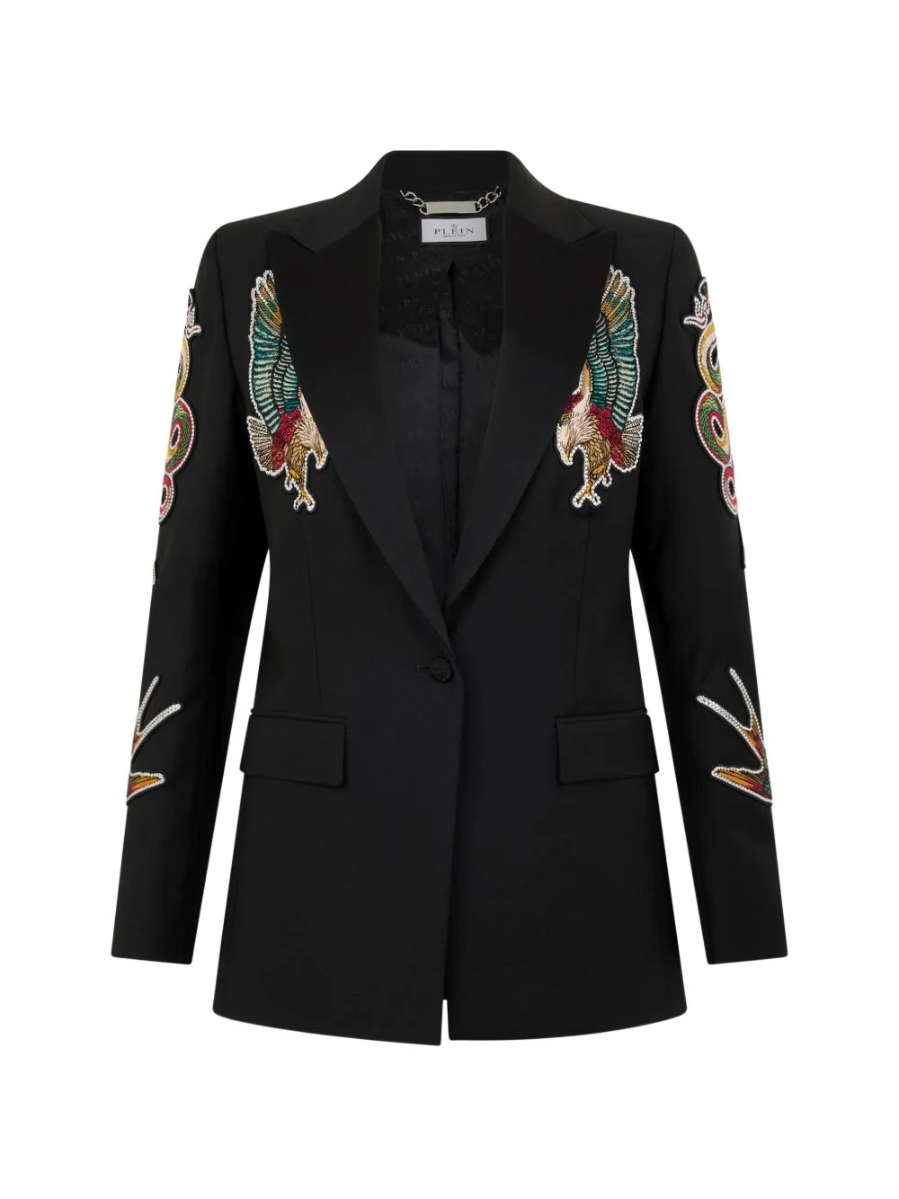 buttoned embroidered blazer Highlights - Black - Satin lapels - Flap pockets - Button fastening - Embroidered patches - Embellishments Made in Italy Composition Outer: Polyester 53%, Virgin Wool 43%, Elastane 4% Lining: Viscose 51%, Acetate 49% Washing instructions Read Manufacturer Guidelines