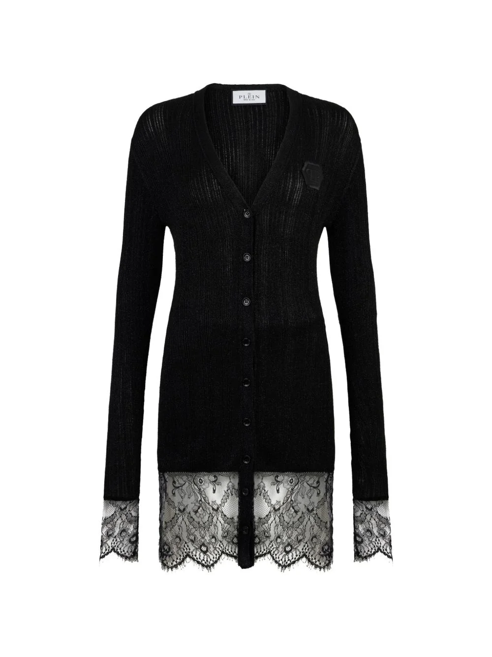 buttoned-up lace-detail mini dress Highlights - Black - Lace trim - Button fastening - V-neck - Long sleeves - Logo applique Made in Italy Composition Viscose 89%, Polyester 11% Washing instructions Read Manufacturer Guidelines