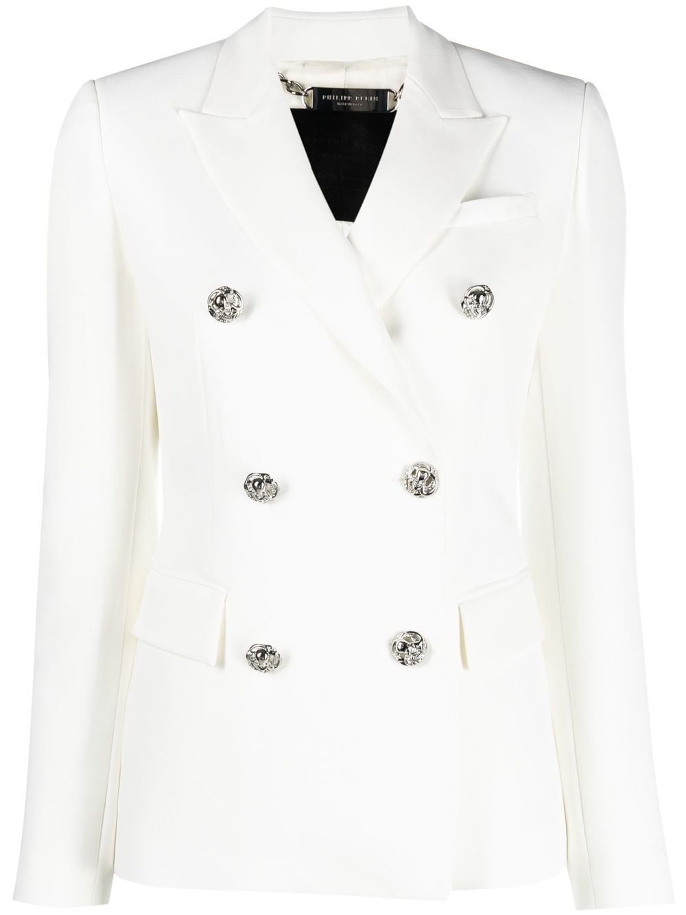 Cady double-breasted blazer Philipp Plein imbues a classic silhouette with its signature rock'n'roll flair. The double-breasted design is recognisable thanks to the silver-tone skull buttons that encapsulate the designer's edgy spirit. Made in Italy Composition Outer: Polyester 99%, Elastane 1% Lining: Viscose 100% SIZE & FIT Model measurements Height 5 ft 11 in(1.8 m) Bust/Chest 32.3 in(82 cm) Hips 36.6 in(93 cm) Waist 24.8 in(63 cm)