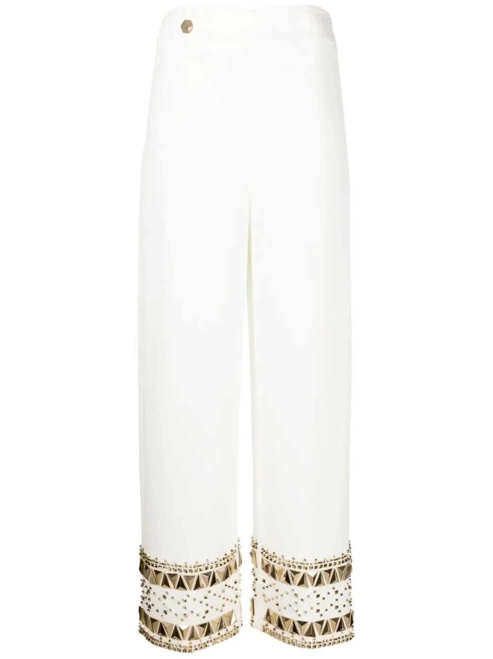 Cady gold-studded trousers white/gold gold-tone stud detailing gold-tone Rockstud detailing high-waisted pressed crease straight leg cropped leg elasticated waistband Made in Italy Composition Outer: Polyester 89%, Spandex/Elastane 11% Lining: Polyester 100% SIZE & FIT Model measurements Height 5 ft 10 in(1.78 m) Bust/Chest 31.49 in(80 cm) Hips 37 in(94 cm) Waist 23.62 in(60 cm) FittingInformation This piece fits true to size. We recommend you get your regular size Designed to be fitted at the waist and hips, loose over the leg Made with a mid-weight stretch fabric Washing instructions Dry Clean Only