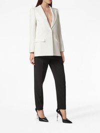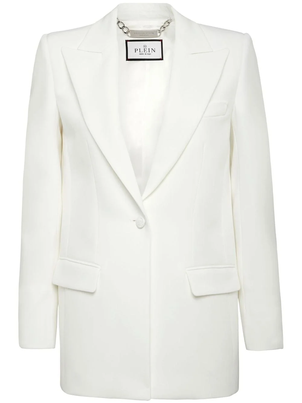 Cady single-breasted peaked blazer Highlights - Optical white - Logo charm - Wide peak lapels - Front button fastening - Chest welt pocket - Two front flap pockets - Long sleeves - Buttoned cuffs - Central rear vent Made in Italy Composition Polyester 50%, Viscose 46%, Elastane 4%