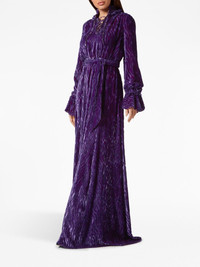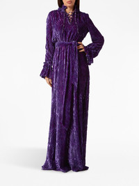 Chiffon Gipsy devore-effect dress Highlights - Amethyst purple - Devore effect - Frilled high neck - Long sleeves - Ruffle cuffs - Belted waist - Front tie fastening - Extra-long length Made in Italy Composition Viscose 61%, Silk 24%, Nylon 15%