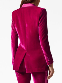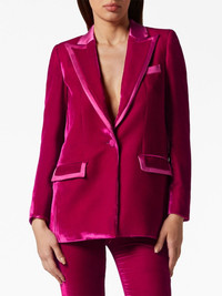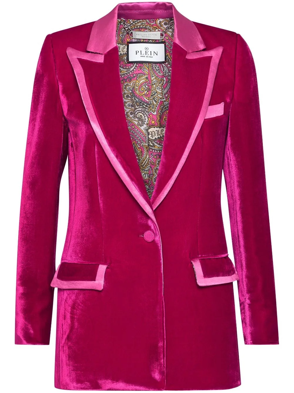 contrasting-trim velvet blazer Highlights - Fuchsia pink - Velvet - Internal paisley print - Classic lapels - Long sleeves - Plunging v-neck - Two front flap pockets - Chest welt pocket - Front button fastening - Contrasting trim Made in Italy Composition Velvet 100%