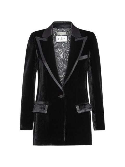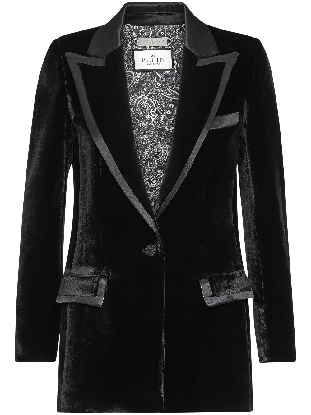 contrasting-trim velvet blazer Highlights - Black - Velvet - Internal paisley print - Classic lapels - Long sleeves - Plunging v-neck - Two front flap pockets - Chest welt pocket - Front button fastening - Contrasting trim Made in Italy Composition Velvet 100%