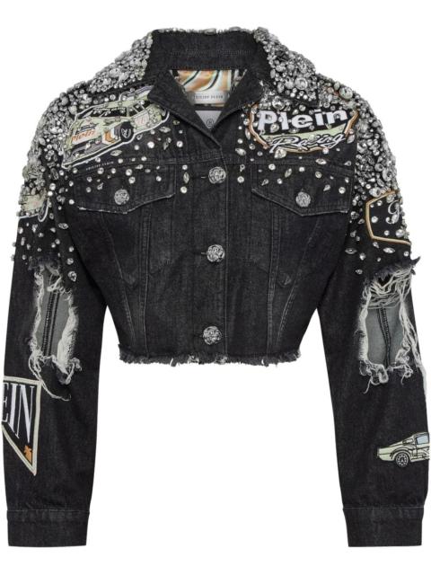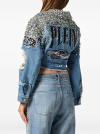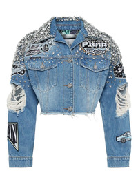 cropped denim jacket Highlights - Blue - Front button fastening - Rhinestone embellishment - Two chest flap pockets - Buttoned cuffs Imported Composition Outer: glass 100%, Cotton 100%, Polyester 100% Lining: Polyester 100% Washing instructions Read Manufacturer Guidelines