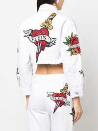cropped Love denim jacket cloud white cotton cropped crystal embellishment heart print classic collar front button fastening long sleeves two chest flap pockets Imported Composition Outer: Cotton 100% Lining: Polyester 65%, Cotton 35% SIZE & FIT Model measurements Height 5 ft 11 in(1.8 m) Bust/Chest 33.07 in(84 cm) Hips 37.4 in(95 cm) Waist 25.19 in(64 cm) FittingInformation This piece fits true to size. We recommend you get your regular size Cut for a slim fit Made with a mid-weight non-stretch fabric