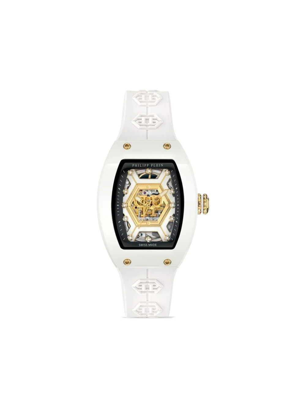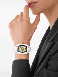 Crypto Queen $NOW WHITE 55mm Highlights - 55 x 45 mm - White - Ceramic - Tonneau face - Skeleton dial - Diamond dial - Baton hands - Applique logo - Automatic movement - Screw-down crown - Logo-embossed strap - Pin-buckle fastening - This item comes with a standard one-year warranty from the brand. - Normal everyday use and external agents may reduce the lustre of gemstones and gold surfaces. to maintain, use specific, non-abrasive products specially meant for cleaning jewellery. Imported SIZE & FIT Measurement DIAMETER 2.4 in(6.1 cm) Minimum Length 7.28 in(18.5 cm) Thickness 0.66 in(1.7 cm) TOTAL LENGTH 9.05 in(23 cm) WIDTH 1.1 in(2.8 cm)