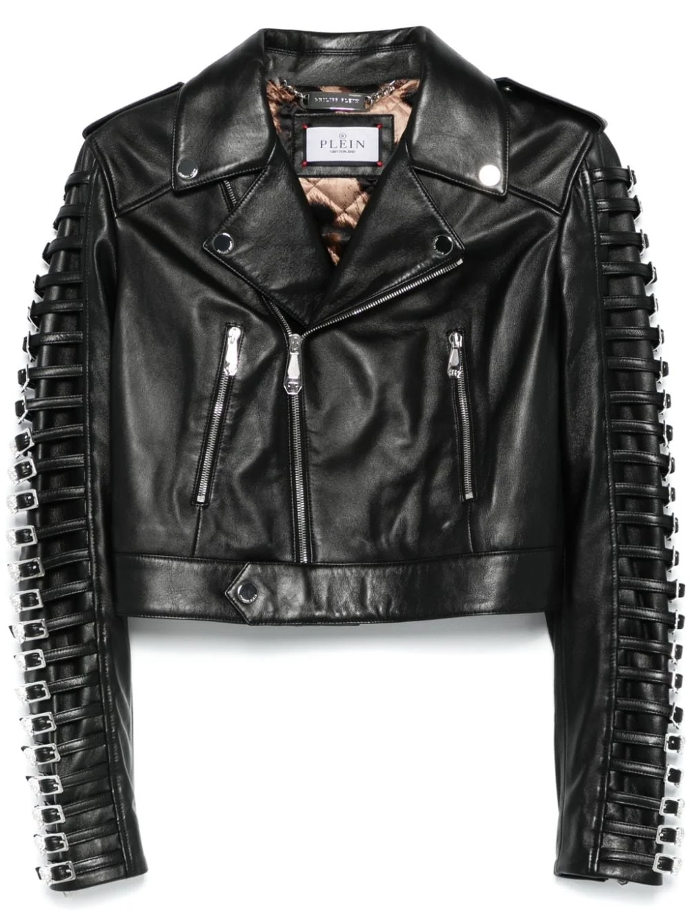 crystal-buckle biker jacket Highlights - Black - Lambskin - Smooth grain - Decorative crystal-buckle detail at the sleeves - Off-centre front zip fastening - Notched collar - Long sleeves - Cuff zips - Two side zip-fastening pockets - Logo patch to the rear - Quilted contrast lining - Straight hem Imported Composition Lining: Polyester 98%, Elastane 2% Outer: Metal 100%, Lamb Skin 100%