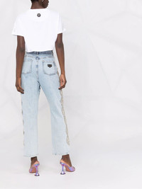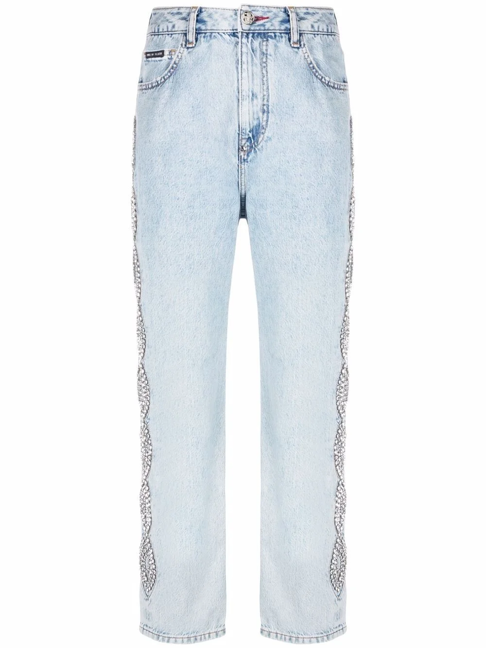 crystal cable jeans Philipp Plein presents these boyfriend jeans for SS22. Crafted in cotton, this pair draw the eye with their crystal cable detailing that encaspulates the house's signature rhinestone embellishment. Highlights - Pale blue - Cotton - Crystal embellishment - Classic five pockets - Boyfriend cut Imported Composition Outer: Cotton 100% Lining: Polyester 65%, Cotton 35% SIZE & FIT Model measurements Height 5 ft 10 in(1.77 m) Bust/Chest 32.28 in(82 cm) Hips 35.03 in(89 cm) Waist 25.19 in(64 cm) FittingInformation This piece fits true to size. We recommend you get your regular size Designed to be fitted at the waist and hips, loose over the leg Made with a mid-weight non-stretch fabric Washing instructions Dry Clean Only