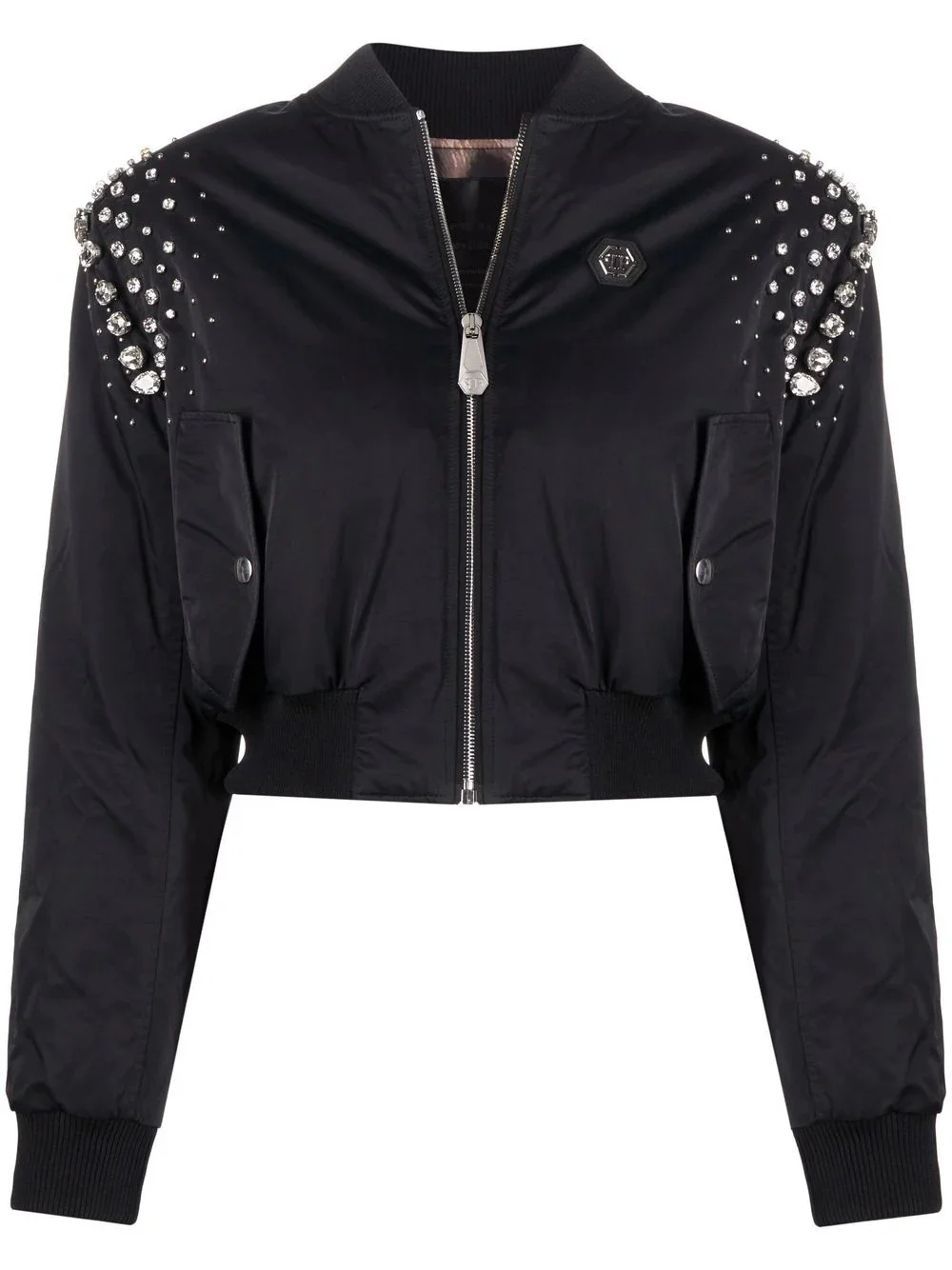 crystal-embellished bomber jacket Philipp Plein puts a glamorous spin on the classic bomber jacket. This black iteration has a cropped length for a contemporary silhouette and it is detailed with crystal embellishments and logo lettering on the rear. Made in Italy Composition Outer: Polyamide 59%, Cotton 41% Lining: Polyester 100% Washing instructions Hand Wash
