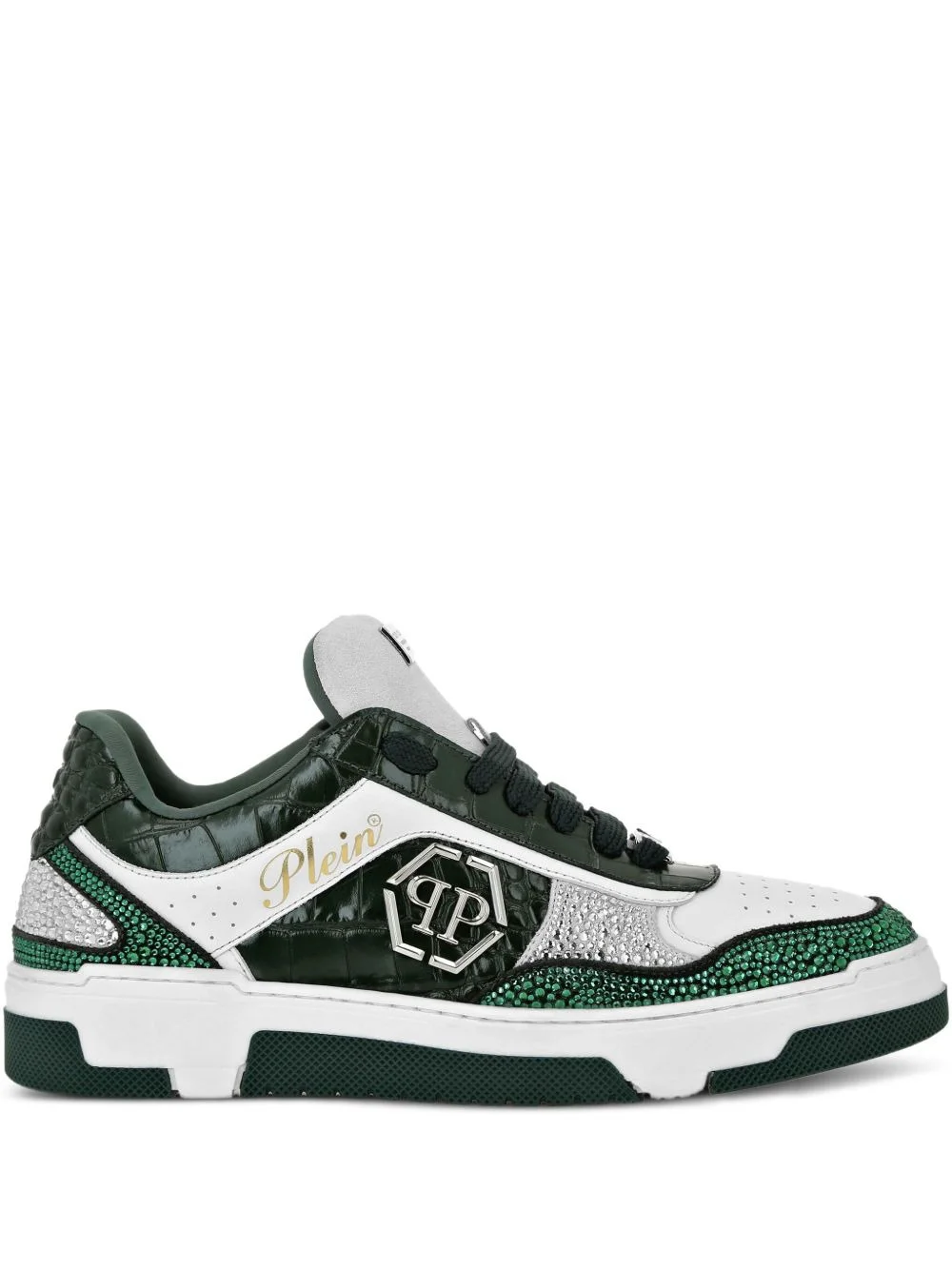 crystal-embellished crocodile-effect sneakers Highlights - Dark green - Embossed crocodile effect - Crystal embellishment - Lace-up fastening - Rubber sole Made in Italy Composition Outer: Bovine Split Leather 100% Sole: Rubber 100% Lining: Polyester 90%, Elastane 10%