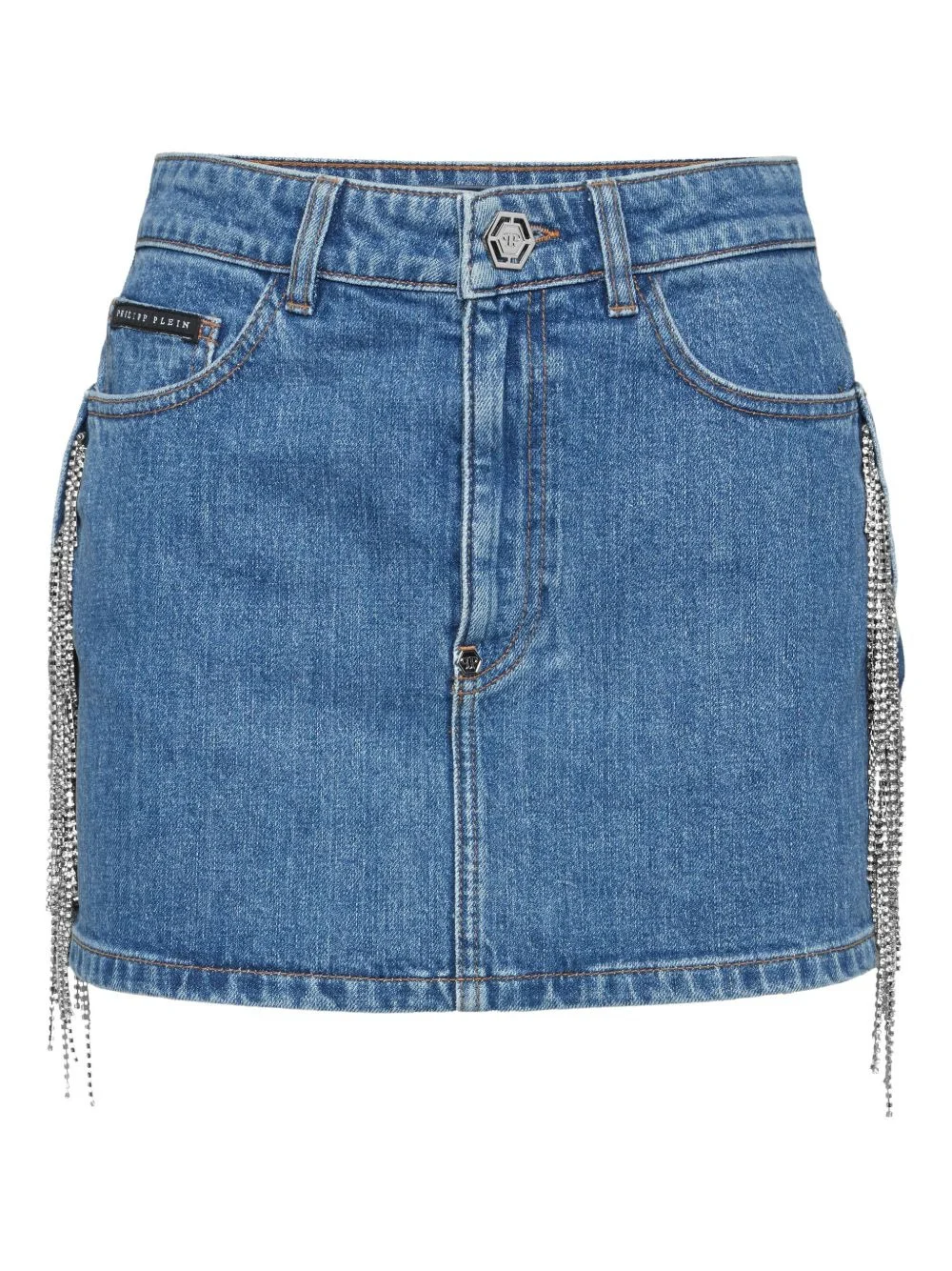 crystal-embellished denim mini skirt Highlights - Blue - Crystal embellishment - Front button fastening - Belt loops - Classic five pockets Imported Composition Fabric 100% Washing instructions Read Manufacturer Guidelines