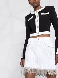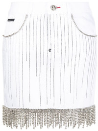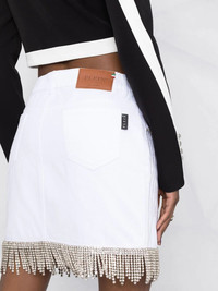 crystal-embellished denim skirt bright-white cotton-blend crystal embellishment front button fastening two diagonal pockets to the sides fringe detailing Imported Composition Lining: Polyester 65%, Cotton 35% Outer: Cotton 100%, Leather 100%, glass 100% SIZE & FIT Model measurements Height 5 ft 11 in(1.8 m) Bust/Chest 31.49 in(80 cm) Hips 36.61 in(93 cm) Waist 24.4 in(62 cm) FittingInformation This piece fits true to size. We recommend you get your regular size Cut for a slim fit Made with a mid-weight non-stretch fabric