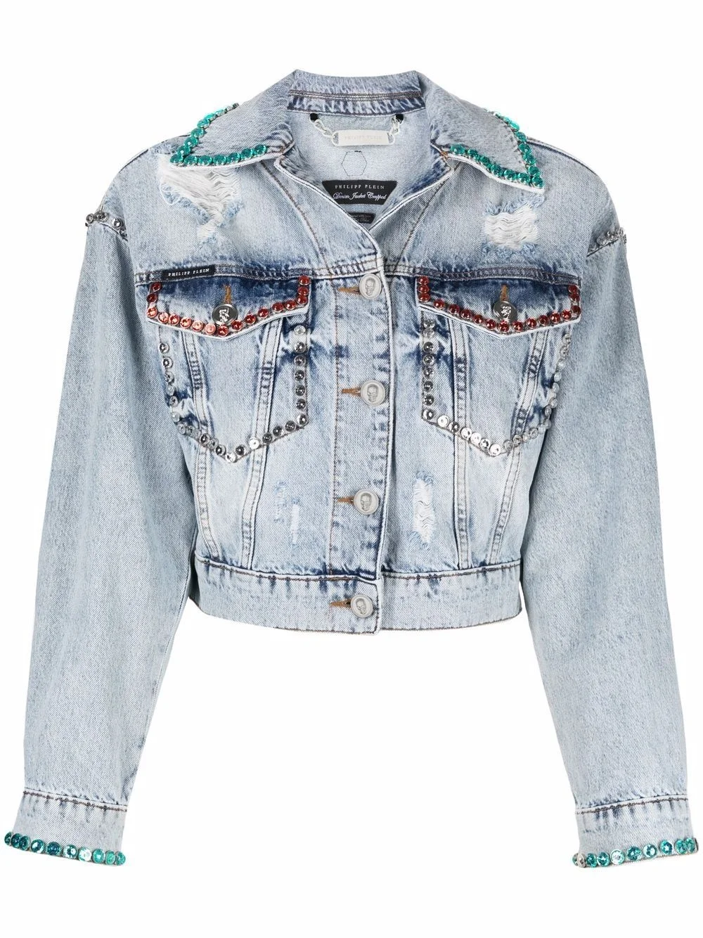 crystal-embellished distressed denim jacket Philipp Plein's unique sense of style is evident in this bleach-effect cropped denim jacket from the labels SS22 collection. Alongside a distressed finish, this eye-catching piece boasts decorative crystal embellishments. Imported Composition Lining: Polyester 65%, Cotton 35% Outer: Cotton 100% SIZE & FIT Model measurements Height 5 ft 10 in(1.77 m) Bust/Chest 32.28 in(82 cm) Hips 35.03 in(89 cm) Waist 25.19 in(64 cm)