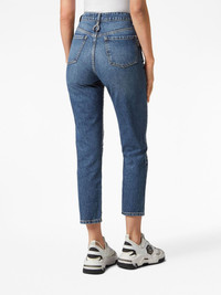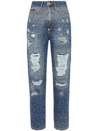 crystal-embellished distressed-denim trousers Highlights - Blue - Cotton - Denim - Crystal embellishment - Distressed effect - Ripped detailing - Classic five pockets - Belt loops - Cropped leg - High-waisted - Front button and zip fastening Imported Composition Cotton 100%