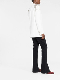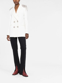 crystal-embellished double-breasted blazer white crystal embellishment peak lapels double-breasted button fastening long sleeves two front welt pockets straight hem Made in Italy Composition Outer: Polyester 89%, Elastane 11% Lining: Polyester 100% SIZE & FIT Model measurements Height 5 ft 11 in(1.8 m) Bust/Chest 31.49 in(80 cm) Hips 36.61 in(93 cm) Waist 24.4 in(62 cm) FittingInformation This piece fits true to size. We recommend you get your regular size Cut for a loose fit Made with a mid-weight non-stretch fabric