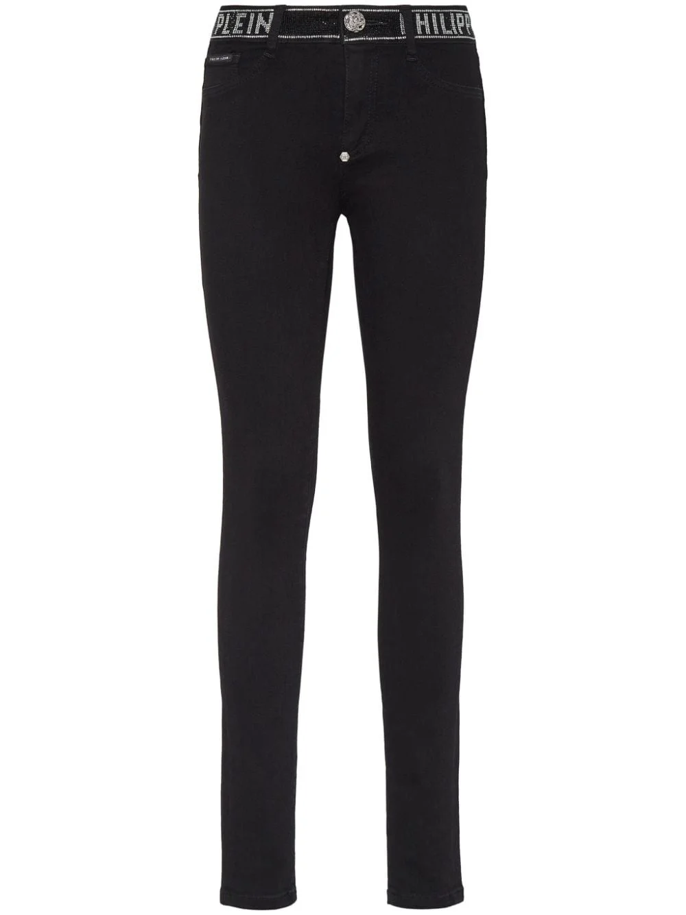 Strass stretch-denim leggings Highlights - Black - Cotton blend - Denim - Logo plaque - Logo waistband - Belt loops - Front button and zip fastening - Super-skinny cut - Classic five pockets - Straight hem Imported Composition Cotton 92%, Elastomultiester 6%, Elastane 2% Washing instructions Read Manufacturer Guidelines