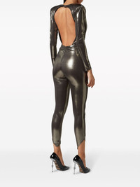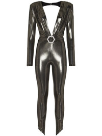 crystal-embellished lame jumpsuit Highlights - Anthracite grey - Lame - Crystal-embellished logo plaque - Plunging v-neck - Long sleeves - Open back - Rear button fastening Imported Composition Polyester 95%, Elastane 5%
