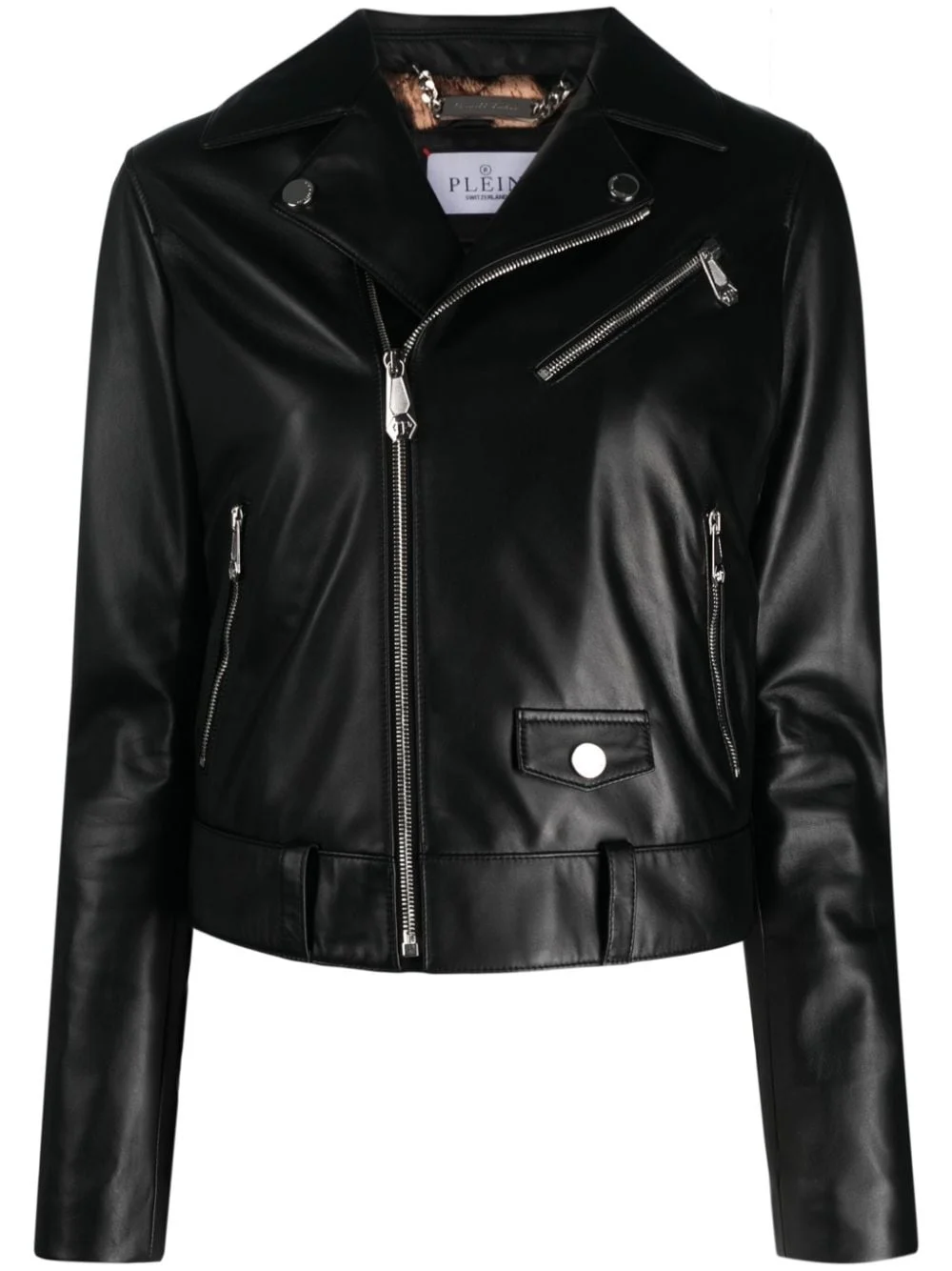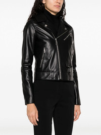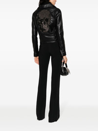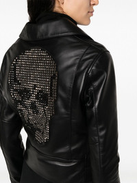 crystal-embellished leather biker jacket Highlights - Black - Lambskin - Crystal embellishment - Skull motif to the rear - Notched collar - Off-centre front zip fastening - Long sleeves - Zip-fastening chest pocket - Two side zip-fastening pockets Imported Composition Outer: Glass Fiber 100%, Lamb Skin 100% Lining: Polyester 100% SIZE & FIT Model measurements Height 5 ft 10 in(1.77 m) Bust/Chest 31.49 in(80 cm) Hips 34.64 in(88 cm) Waist 23.22 in(59 cm)