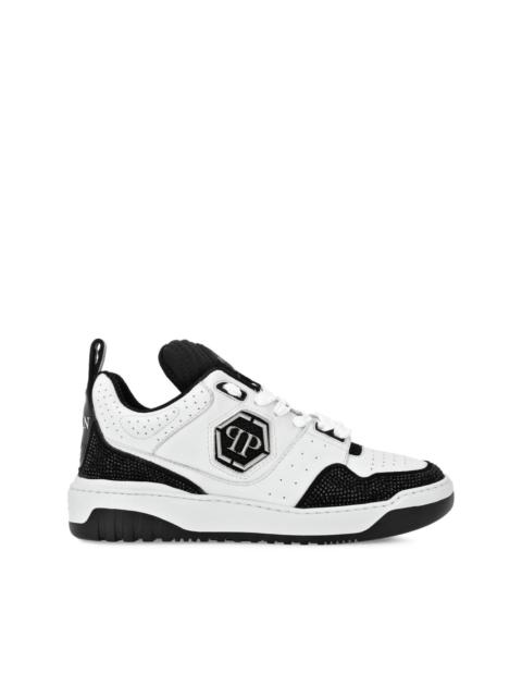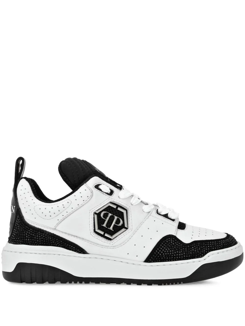 crystal-embellished leather sneakers Highlights - Optical white/black - Calf leather/calf suede - Mesh panelling - Perforated detailing - Logo patch to the side and tongue - Pull-tab at the heel - Round toe - Front lace-up fastening - Branded insole - Flat rubber sole Made in Italy Composition Leather 100%