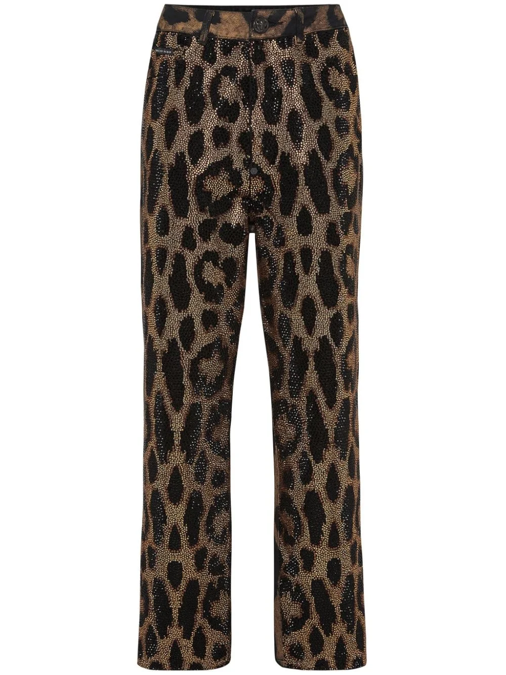 crystal-embellished leopard jeans Highlights - Chestnut brown/black - Cotton - Denim - All-over leopard print - Crystal embellishment - Logo patch to the rear - Logo patch to the front - Straight leg - Mid-rise - Belt loops - Front button and zip fastening - Classic five pockets Imported Composition Cotton 100% Lining: Polyester 65%, Cotton 35%