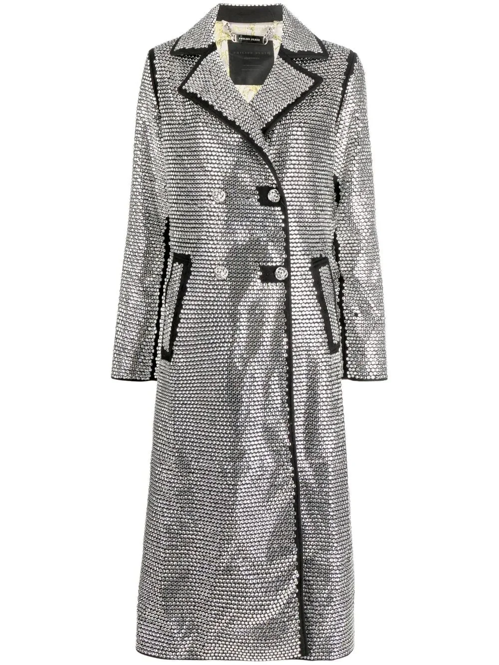 crystal-embellished long coat metallic effect/black crystal embellishment double-breasted button fastening notched collar contrast stitching long sleeves Imported Composition Outer: glass 100%, Polyester 64%, Viscose 33%, Spandex/Elastane 3% Lining: Polyester 100% SIZE & FIT Model measurements Height 5 ft 11 in(1.8 m) Bust/Chest 31.49 in(80 cm) Hips 35.43 in(90 cm) Waist 24.4 in(62 cm) FittingInformation This piece fits true to size. We recommend you get your regular size Cut for a loose fit Made with a heavyweight fabric Washing instructions Dry Clean Only