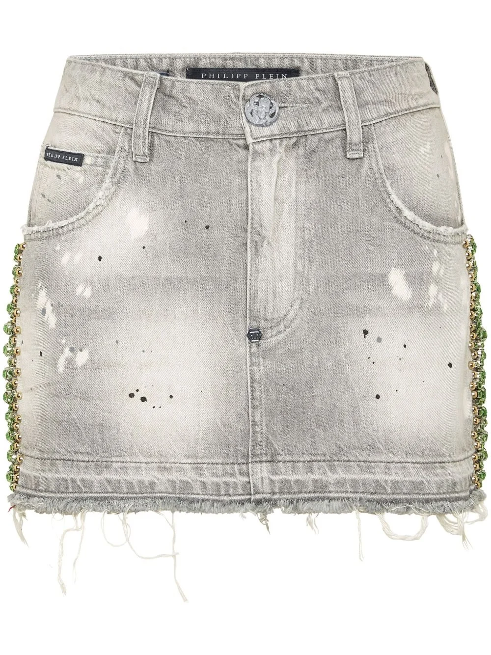 crystal-embellished mini skirt Highlights - Light grey - Concealed front fastening - Belt loops - Classic five pockets - Logo patch to the rear Imported Composition Outer: Cotton 100%, glass 100%, Metal 100% Lining: Polyester 65%, Cotton 35%