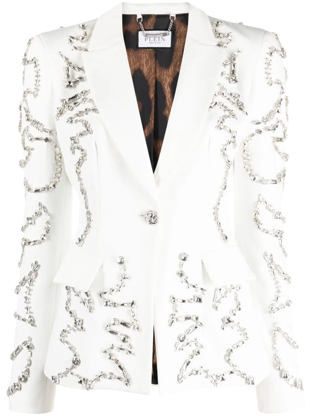 crystal-embellished single-breasted blazer cloud white crystal embellishment classic lapels front button fastening long sleeves two front flap pockets Made in Italy Composition Outer: Polyester 97%, Spandex/Elastane 3% Lining: Polyester 97%, Spandex/Elastane 3% Washing instructions Dry Clean Only