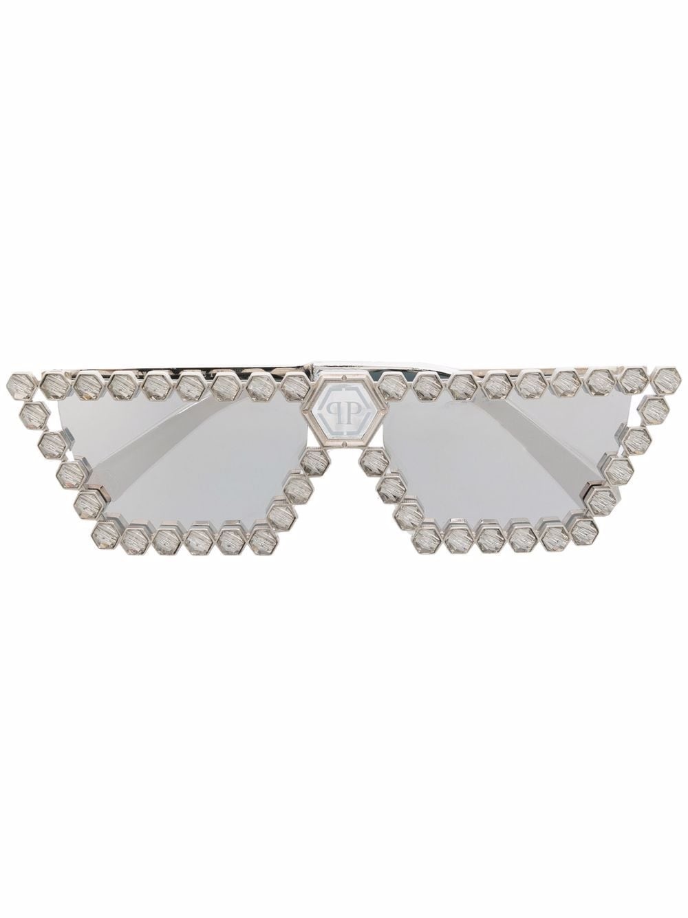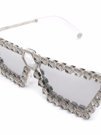 crystal-embellished square-frame sunglasses silver-tone crystal embellishment grey tinted lenses silver-tone hardware These glasses come with a protective case. oversize frame Imported Composition Metal 100% SIZE & FIT Measurement Arm Length 5.9 in(15 cm) Bridge Width 0.7 in(1.8 cm) Lens Diameter 2.36 in(6 cm) Total Width 5.9 in(15 cm)