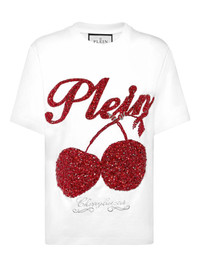 crystal-embellished T-shirt Highlights - White/red - Crystal embellishment - Crew neck - Short sleeves - Straight hem Imported Composition Cotton 100%, Brass 100%, glass 100% Washing instructions Read Manufacturer Guidelines