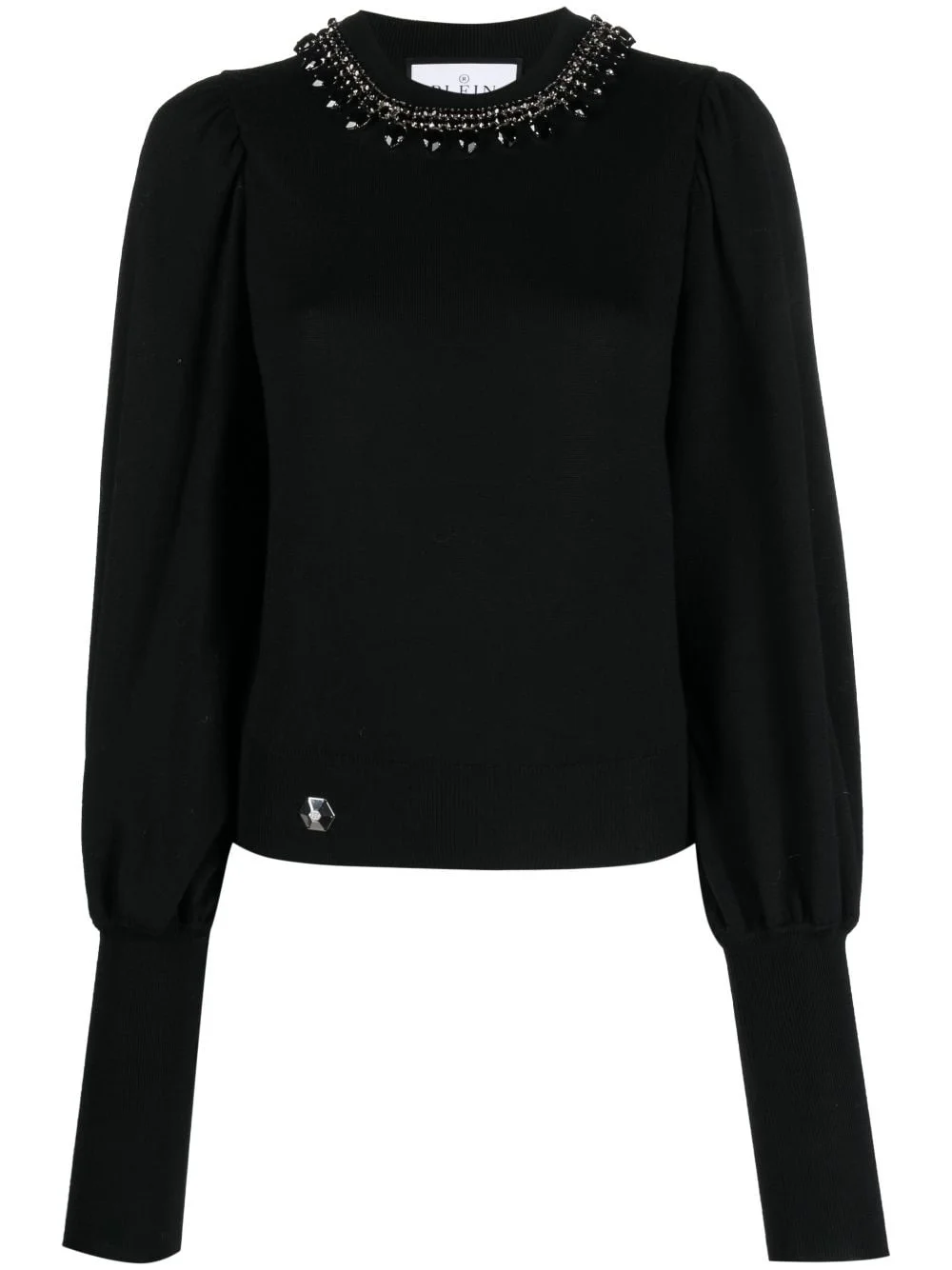 Crystal-embellished wool knitted jumper Highlights - Black - Wool - Knitted construction - Pullover design - Rhinestone embellishment - Silver-tone logo plaque - Long puff sleeves - Round neck - Ribbed cuffs and hem Made in Italy Composition Wool 100% Washing instructions Machine Wash