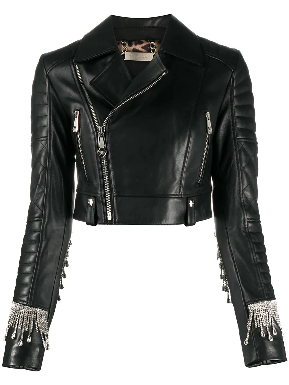 crystal-fringe biker jacket black lambskin spread collar off-centre front zip fastening front zip fastening pockets belt loops long sleeves quilted crystal embellishment embroidered logo to the rear cropped Imported Composition Outer: Lamb Skin 100% Lining: Polyester 97%, Spandex/Elastane 3% Washing instructions Specialist Cleaning