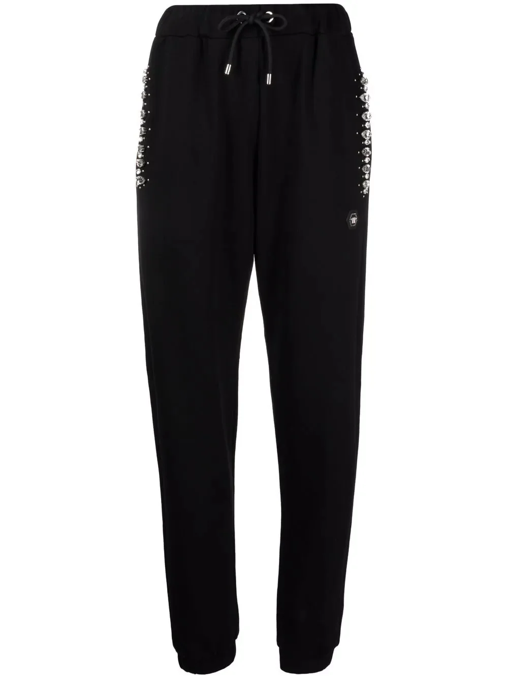 crystal iconic-plein track pants black cotton crystal embellishment logo plaque elasticated ankles elasticated drawstring waistband Made in Italy Composition Cotton 100% SIZE & FIT Model measurements Height 5 ft 10 in(1.79 m) Bust/Chest 33.07 in(84 cm) Hips 35.82 in(91 cm) Waist 24.01 in(61 cm) FittingInformation This piece fits true to size. We recommend you get your regular size Designed to be loose over the leg with a fitted waist and hem Made with a mid-weight fabric Washing instructions Hand Wash