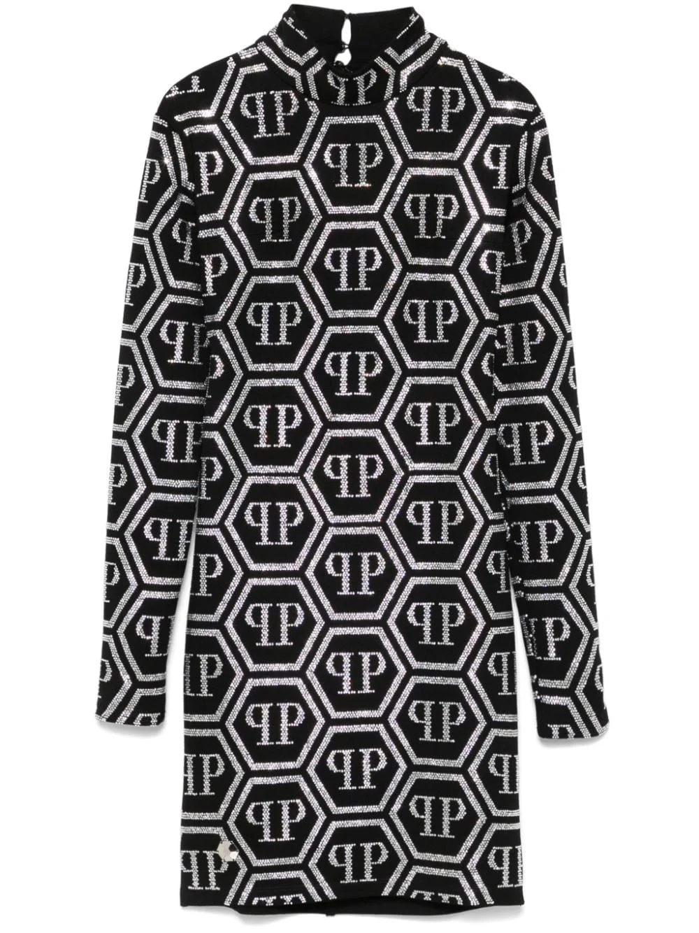monogram-embellished mini dress Highlights - Black - Stretch-design - Monogram pattern - Crystal embellishment - Rear button fastening - Concealed rear zip fastening - Mock neck - Long sleeves - Cut-out detailing - Low back - Full lining - Straight hem - Thigh-length Made in Italy Composition Outer: Viscose 70%, Polyester 22%, Elastane 8% Lining: Cotton 100% SIZE & FIT Model measurements Height 5 ft 9 in(1.75 m) Bust/Chest 31.88 in(81 cm) Hips 34.64 in(88 cm) Waist 24.01 in(61 cm) FittingInformation Designed for a slim fit that sits just away from the body offering a close yet comfortable fit Made from a midweight non-stretch fabric, this piece offers minimal elasticity when worn Washing instructions Machine Wash