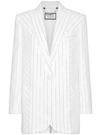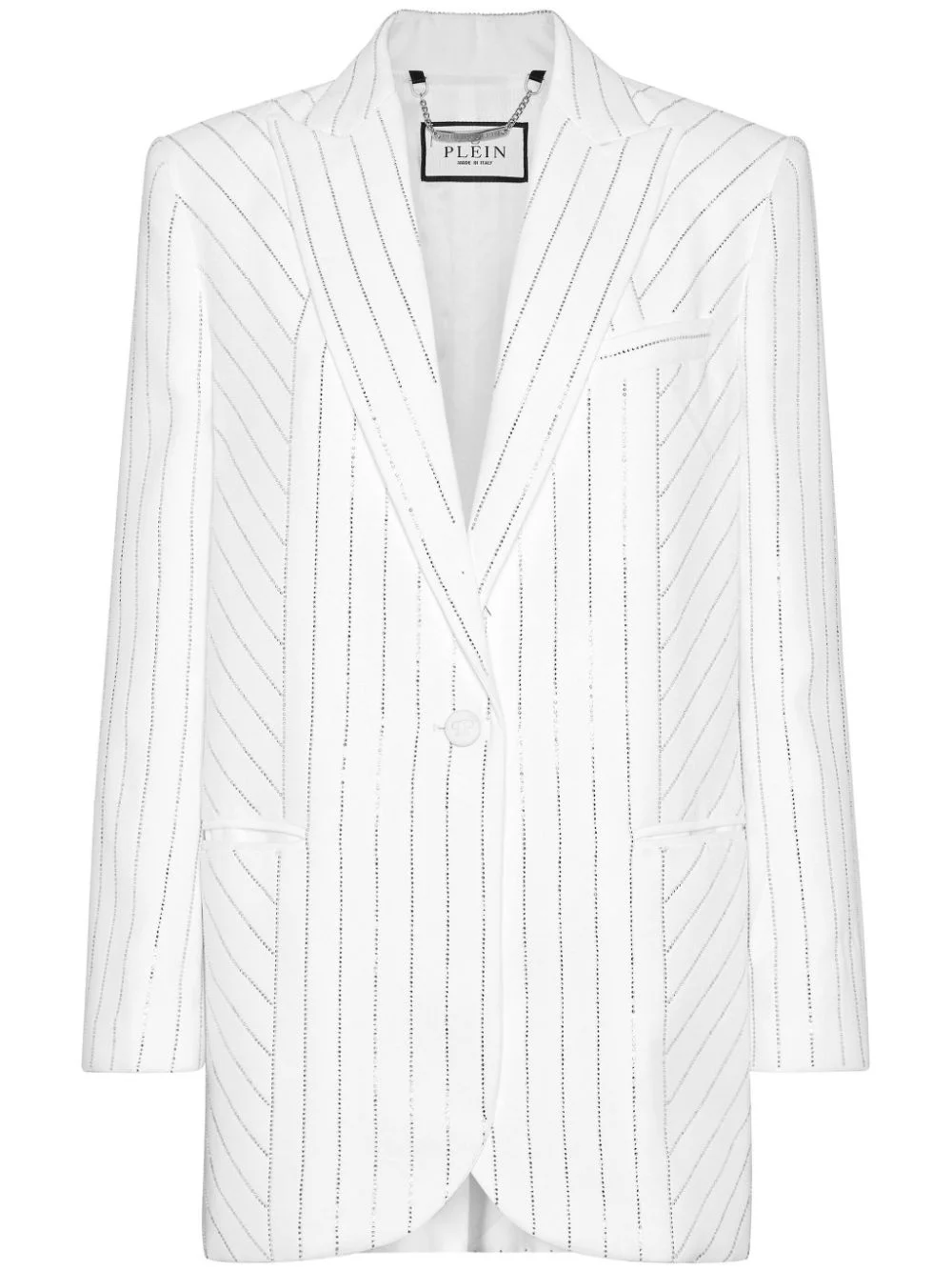 crystal-pinstripe cady blazer Highlights - White - Cady texture - Crystal embellishment - Pinstripe pattern - Notched lapels - Front button fastening - Long sleeves - Buttoned cuffs - Chest welt pocket - Two side welt pockets - Front curved hem - American rear vent Made in Italy Composition Outer: Viscose 51%, Acetate 46%, Elastane 3% Lining: Viscose 100%