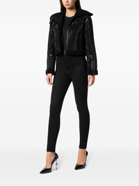 crystal shearling jacket Highlights - Black - Front zip fastening - Two side welt pockets - Cuff zips - Spread collar Imported Composition Sheep Skin/Shearling 100%, Acrylonitrile Butadiene Styrene (ABS) 100%, Lambskin 100%