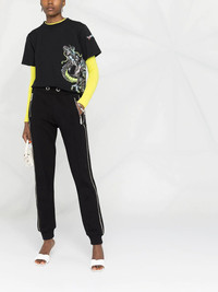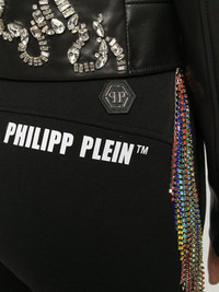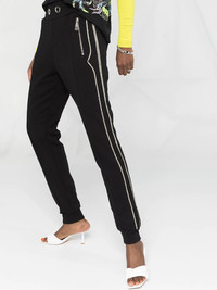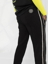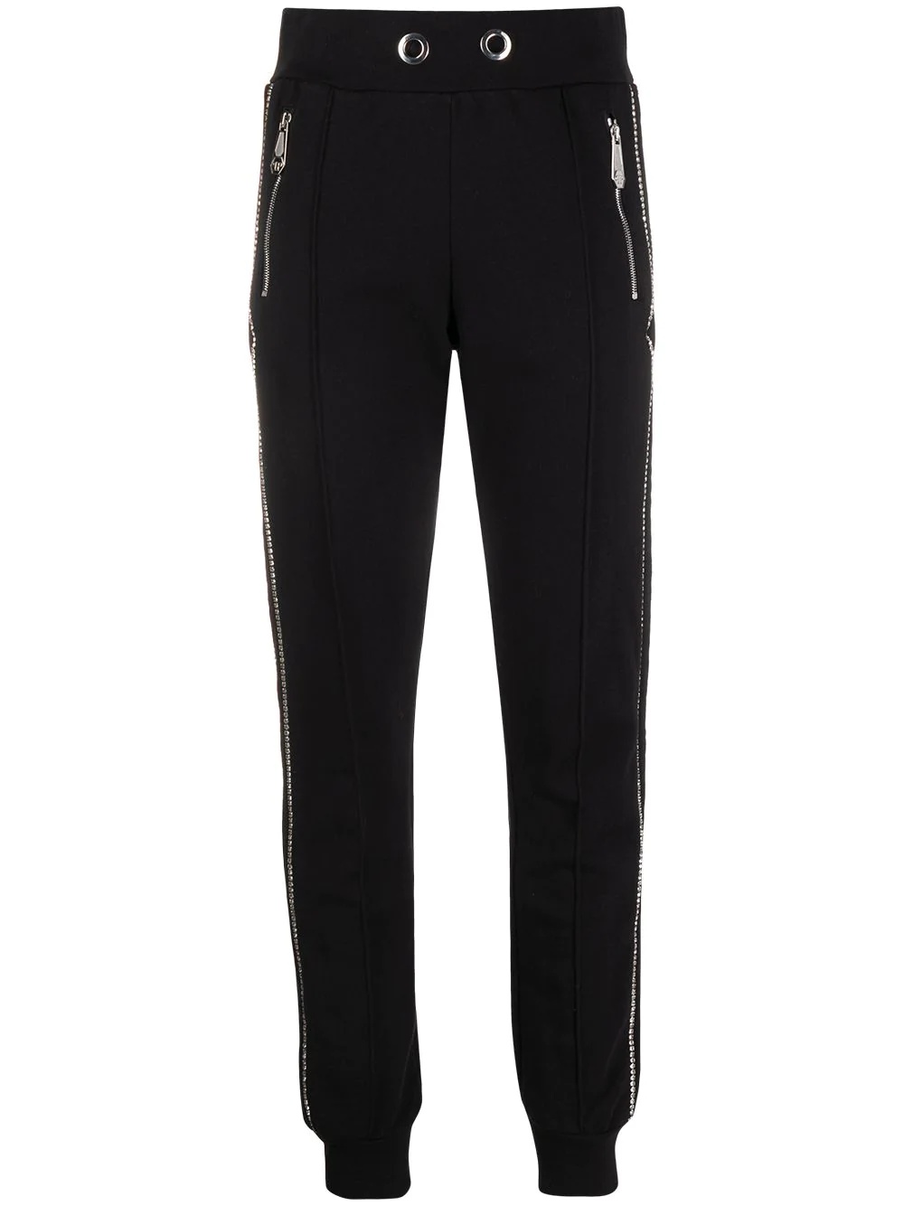 Black cotton crystal stripe track trousers from PHILIPP PLEIN featuring crystal embellishment, high waist, elasticated waistband, two side slit pockets, two side zip-fastening pockets, logo patch to the rear, slim fit and elasticated ankles. Highlights - Black - Cotton - Crystal embellishment - High waist - Elasticated waistband - Two side slit pockets - Two side zip-fastening pockets - Logo patch to the rear - Slim fit - Elasticated ankles Made in Italy Composition Cotton 100%