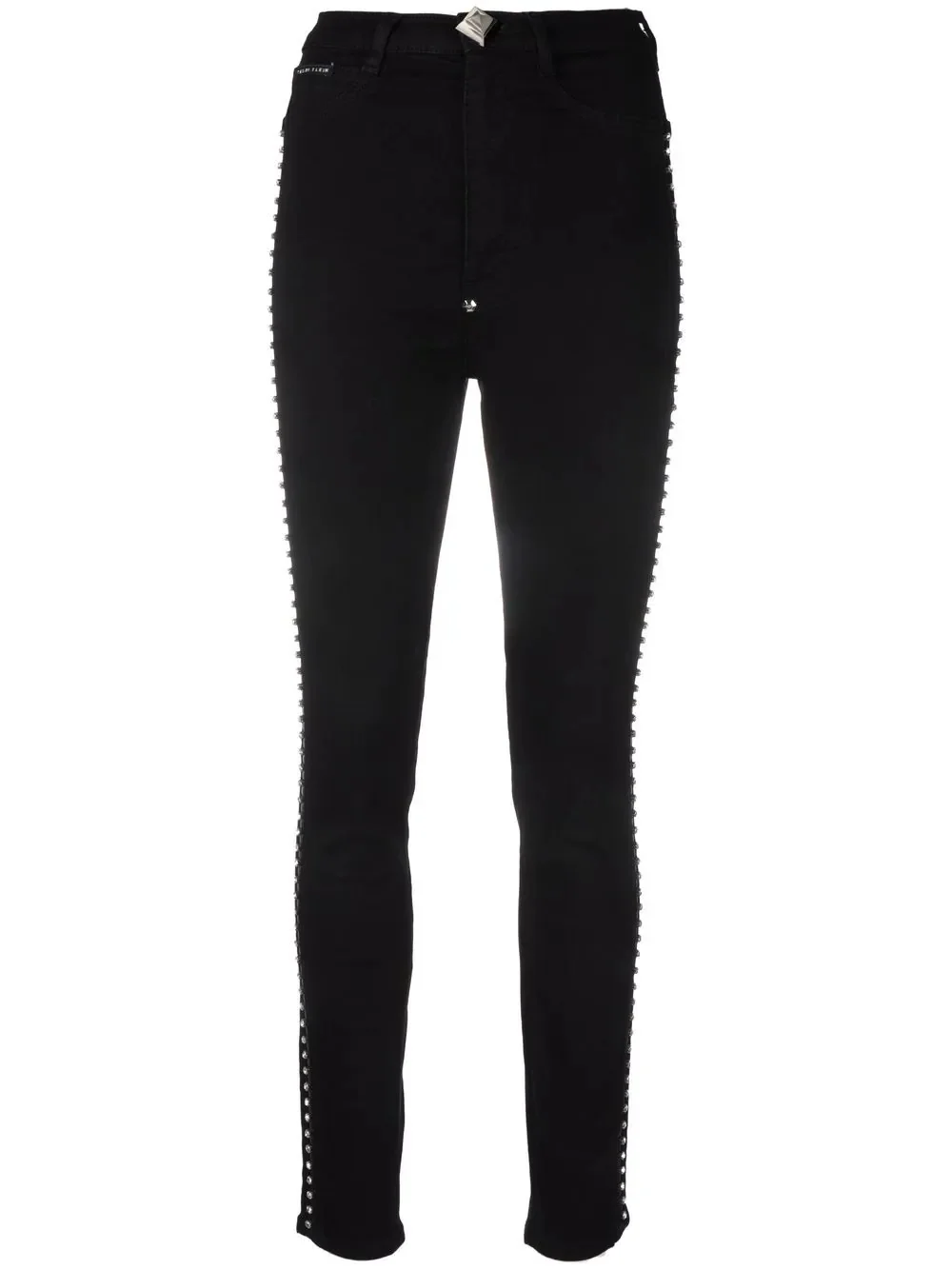 Crystal super high-waist skinny jeans black cotton blend and leather leather trim crystal embellishment high waist belt loops front button fastening Imported Composition Calf Leather 100%, Cotton 92%, Polyester 6%, Spandex/Elastane 2% SIZE & FIT Model measurements Height 5 ft 10 in(1.78 m) Bust/Chest 31.49 in(80 cm) Hips 36.22 in(92 cm) Waist 25.59 in(65 cm) FittingInformation This piece fits true to size. We recommend you get your regular size Cut for a close fit Made with a mid-weight stretch fabric Washing instructions Hand Wash