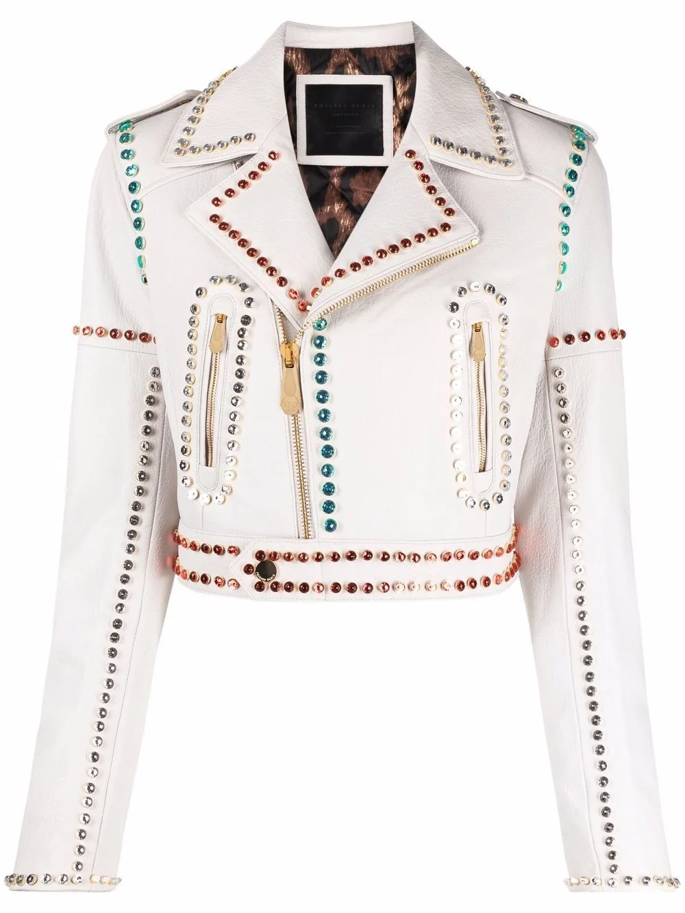 crystal-trim studded cropped biker jacket Staying true to the brands contemporary approach, this cropped biker jacket forms part of Philipp Plein's SS22 collection. Fabricated in white lambskin leather, multicolour crystal embellishments elevate this everyday piece. Imported Composition Outer: Lamb Skin 100% Lining: Polyester 97%, Spandex/Elastane 3% SIZE & FIT Model measurements Height 5 ft 10 in(1.77 m) Bust/Chest 27.95 in(71 cm) Hips 33.85 in(86 cm) Waist 23.22 in(59 cm) FittingInformation This piece fits true to size. We recommend you get your regular size Cut for a loose fit Made with a mid-weight non-stretch fabric Washing instructions Specialist Cleaning