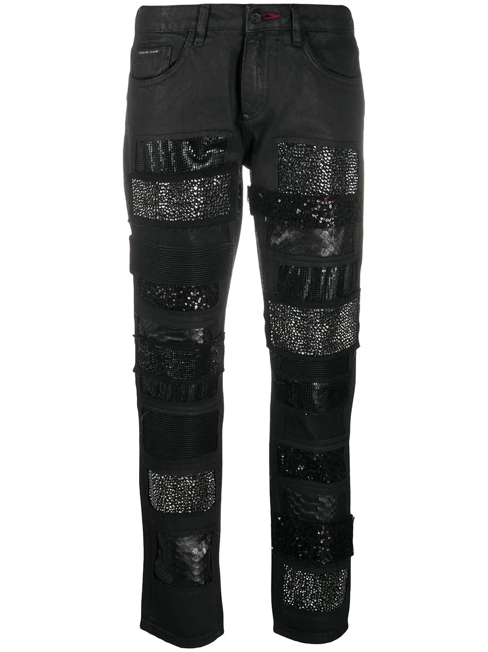 customised boyfriend jeans Highlights - Black/grey - Cotton - Metallic effect - button fastening - Boyfriend fit - Contrasting panel detail - Sequin embellishment Imported Composition Outer: Cotton 100%, Snake Skin 100%, Polyester 100%, Polyurethane 100%, Glass Fiber 100%, Metal 100% Lining: Polyester 65%, Cotton 35% SIZE & FIT Model measurements Height 5 ft 11 in(1.8 m) Bust/Chest 33.07 in(84 cm) Hips 37.4 in(95 cm) Waist 25.19 in(64 cm) FittingInformation This piece fits true to size. We recommend you get your regular size Cut for a slim fit Made with a mid-weight non-stretch fabric Washing instructions Dry Clean Only