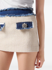 denim-trimmed tweed miniskirt Highlights - White/indigo blue - Tweed - Denim trim - Frayed detailing - Crystal-embellished buttons - Contrasting waistband - Straight hem - Thigh-length Made in Italy Composition Polyester 83%, Acrylic 15%, other fibers 2%