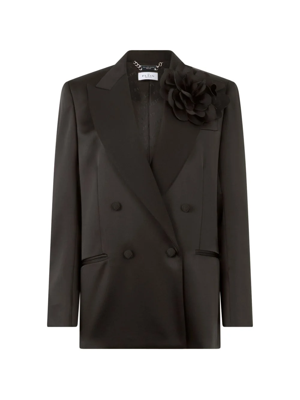 double-breasted satin blazer Highlights - Black - Flower applique - Double-breasted - Peak lapels - Button fastening - Satin finish Made in Italy Composition Body: Polyester 96%, Lycra 4% Lining: Viscose 51%, Bio Acetate 49% Polyester 96%, Lycra 4% Washing instructions Read Manufacturer Guidelines