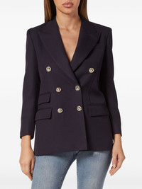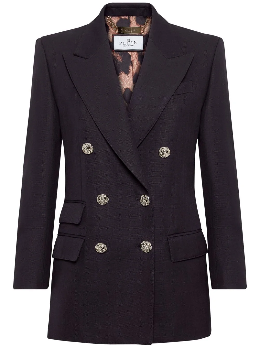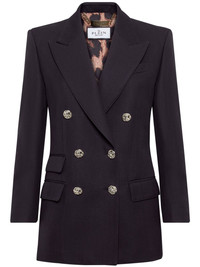 double-breasted wool blazer Highlights - Navy blue - Wool - Embossed silver-tone buttons - Peak lapels - Double-breasted button fastening - Shoulder pads - Long sleeves - Buttoned cuffs - Ticket pocket - Two side flap pockets - American rear vent - Straight hem - Leopard print lining Made in Italy Composition Wool 100% Washing instructions Read Manufacturer Guidelines