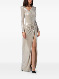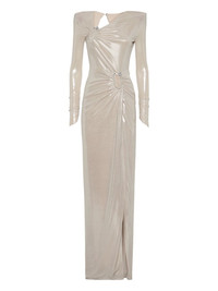 draped evening dress Highlights - Light beige - Gathered detail - Cut-out back - Embellished detailing - Long sleeves Made in Italy Composition Fabric 100% Washing instructions Read Manufacturer Guidelines