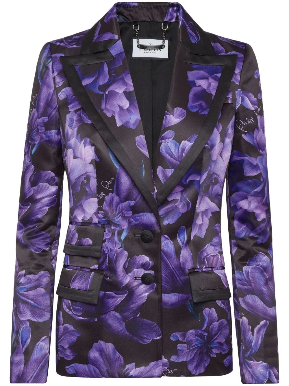 Duchesse floral-print blazer Highlights - Black/purple - All-over floral print - Peak lapels - Front button fastening - Long sleeves - Buttoned cuffs - Jetted chest pocket - Three front flap pockets - Straight hem Made in Italy Composition Lining: Polyester 97%, Spandex/Elastane 3% Outer: Polyester 100%